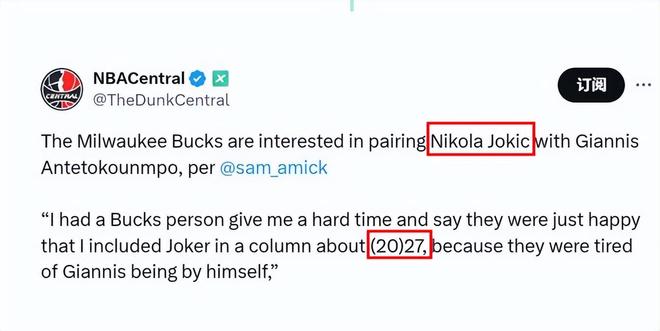 还真别说,不是没有这样的可能;著名媒体《NBACentral》发文报道,雄鹿队想要引进约基奇来搭配字母哥;名记Amick也确认,雄鹿队确实对约基奇感兴趣。
