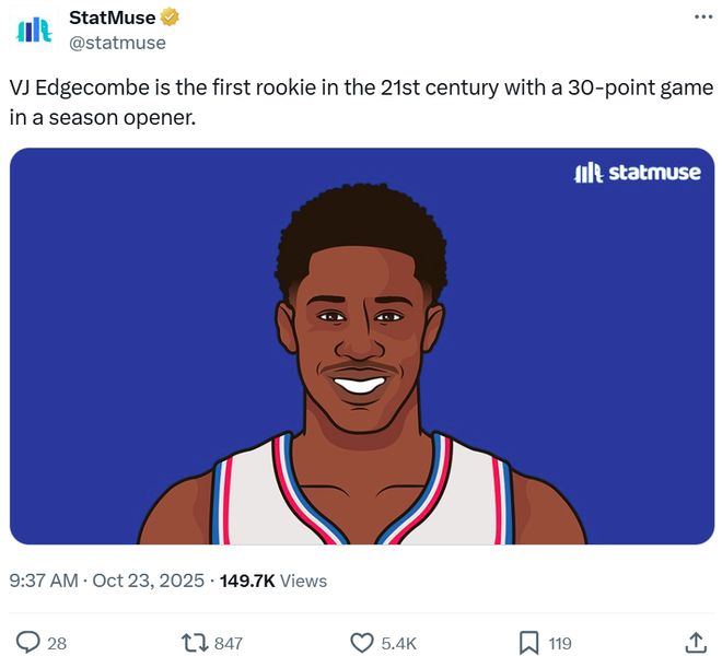 76人队新科榜眼秀埃奇库姆的表现则更加炸裂,全场26投13中,三分13中5,狂砍34分7篮板3助攻1抢断,要知道,这才是这名20岁年轻人NBA正赛首秀。