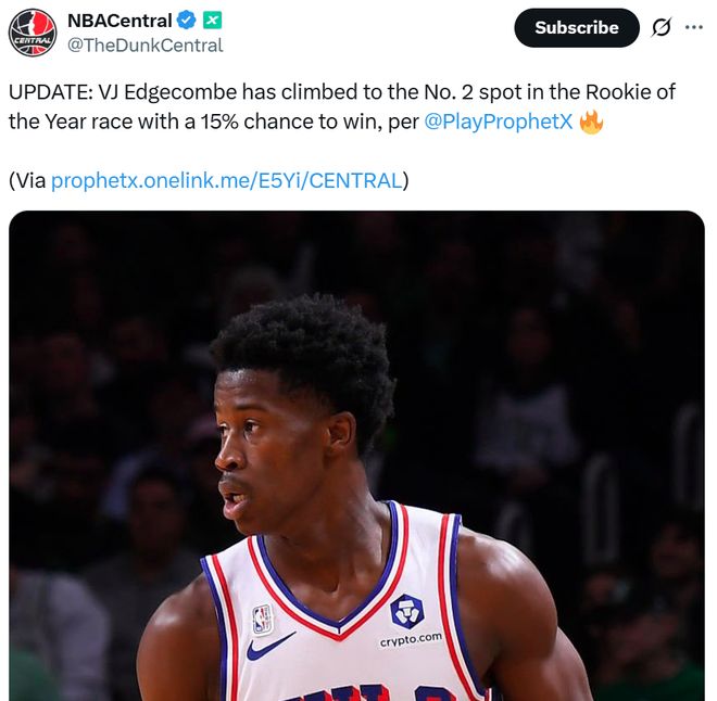 本场比赛结束后,美媒ProphetX迅速更新年度最佳新秀概率,其中埃奇库姆飙升至15%。