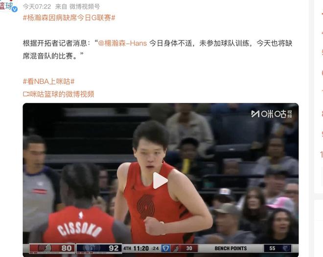 本来按照球队透露的计划,杨瀚森应该在本周三的早上去征战发展联盟的比赛。大家也期待他能够在结束了灰熊的比赛之后,有一些新的东西可以出来。但没有想到在这场比赛即将开始的时候,目前开拓者的记者却透露杨瀚森因为身体不适的问题,没有参加球队的训练,也将会缺席这一次的比赛。这难免让球迷猜测纷纷,到底出现了什么问题,难道杨瀚森的身体真的是因为此前被周志豪打伤了吗?