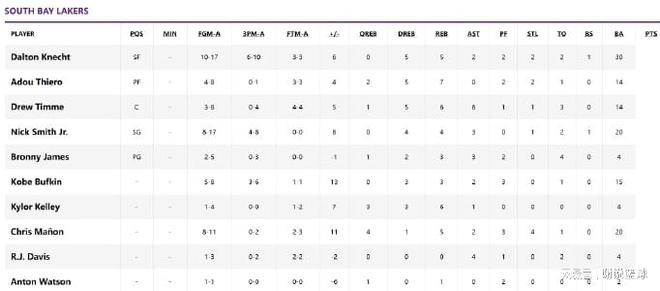 此外湖人阵中还有多名球员,在这场比赛中出战,后卫小尼克-史密斯以近5成命中率,拿到17分4个篮板3次助攻,毕竟本赛季他在湖人,都曾经作为奇兵助队取胜,在发展联盟更是大杀四方了。次轮秀阿杜-蒂耶罗,复出后更多也被下放锻炼,拿到14分7个篮板再加上2次抢断,算是很好展现自己特点。此外科比-巴夫金、德鲁-提米和克里斯-马农,这些让人熟悉的球员,同样有两位数得分贡献,此战南湾湖人全民皆兵。