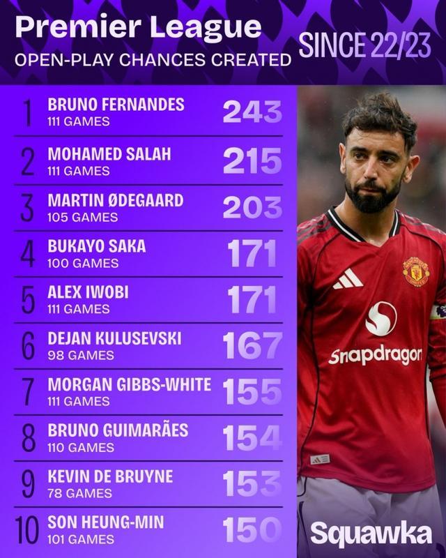2223赛季开始英超运动战创造机会榜:B费243次第一,萨拉赫第二