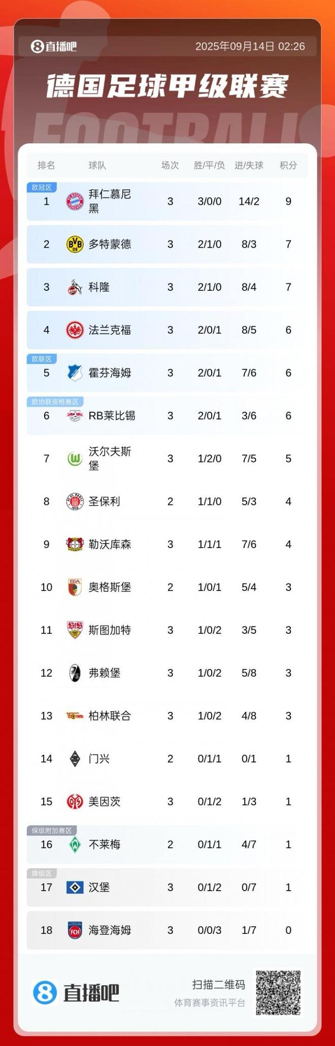 直播吧09月14日宣 德甲第3轮,拜仁5-0大胜汉堡,三连胜继续领跑。