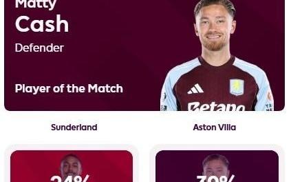 1进球5次成功对抗!卡什被评为维拉11桑德兰全场最佳