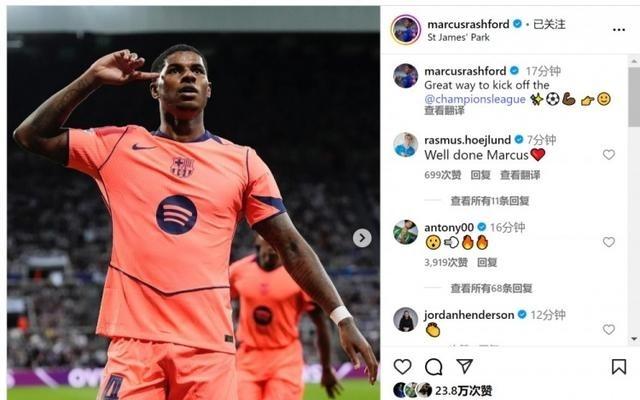 梅开二度!拉什福德社媒晒照庆祝,霍伊伦、安东尼留言点赞