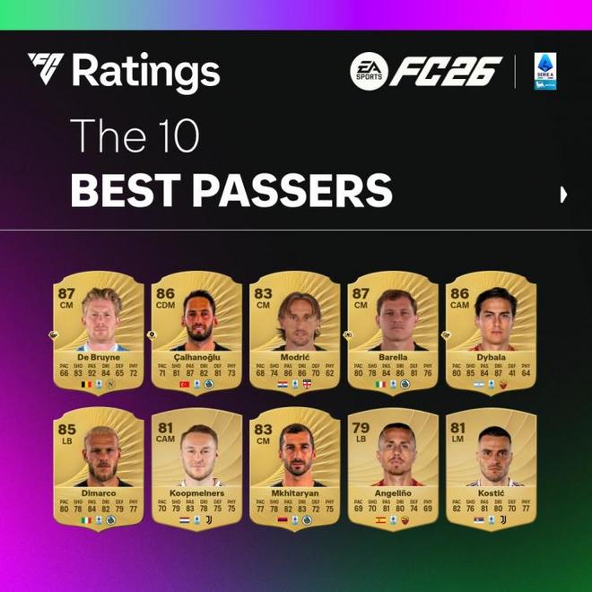 直播吧9月13日宣 FC26意甲球员传球评分top10公布,德布劳内92居首,恰尔汗奥卢、莫德里奇第二三位。