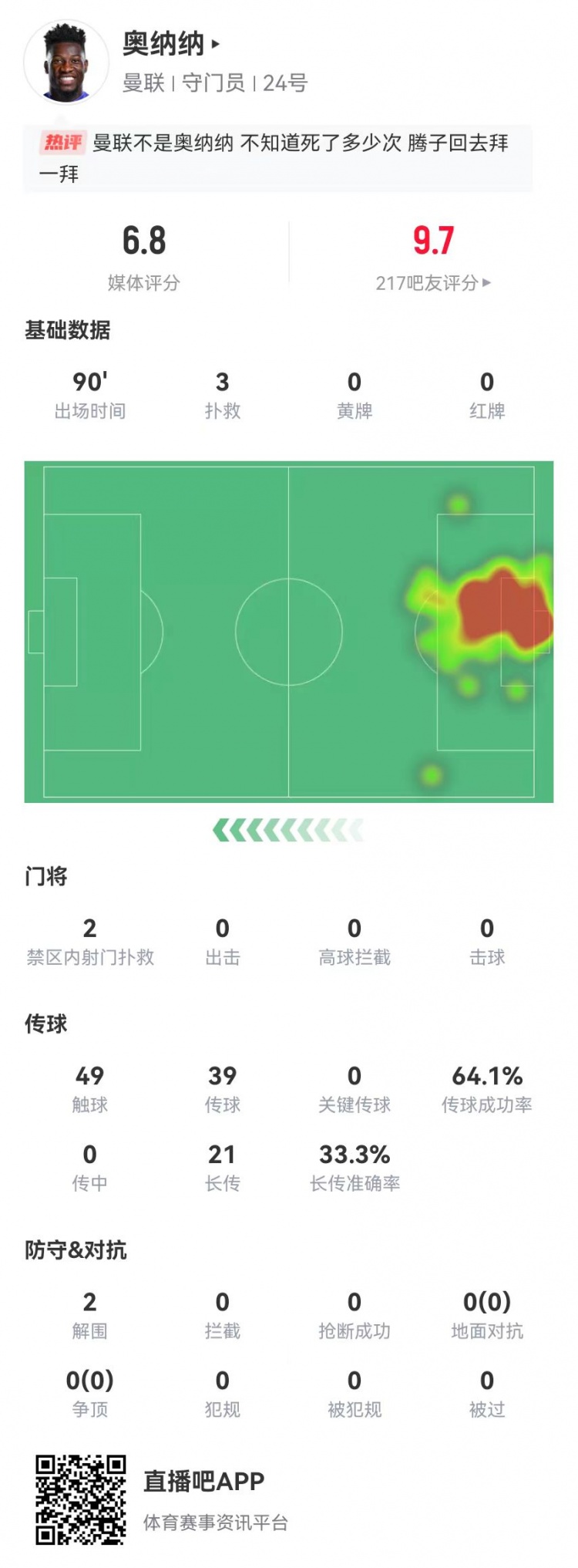 10月25日报道 曼联在本轮欧联杯1-1战平费内巴切,奥纳纳本场数据如下: