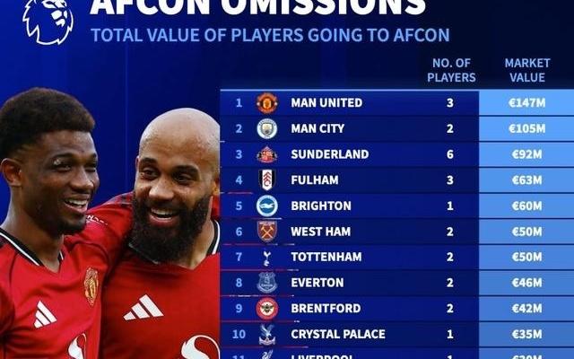 德转列英超球队非洲杯参赛球员总身价榜:曼联3人1.47亿欧第1