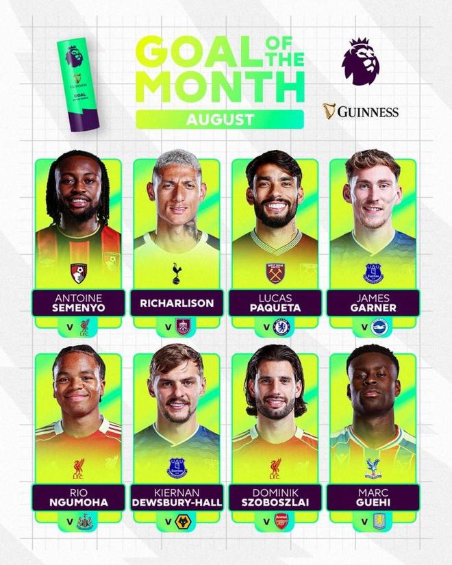 直播吧9月4日宣 英超官方公布了8月最佳进球候选,理查利森倒钩、索博斯洛伊任意球在列。
