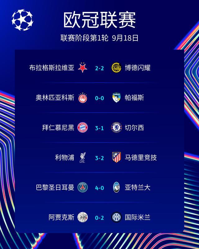 至此,25-26赛季欧冠联赛阶段第1轮,9月18日的6场比赛战罢:布拉格斯拉维亚2-2博德闪耀、奥林匹亚科斯0-0帕福斯、拜仁慕尼黑3-1切尔西、利物浦3-2马德里竞技、巴黎圣日耳曼4-0亚特兰大、阿贾克斯0-2国际米兰!