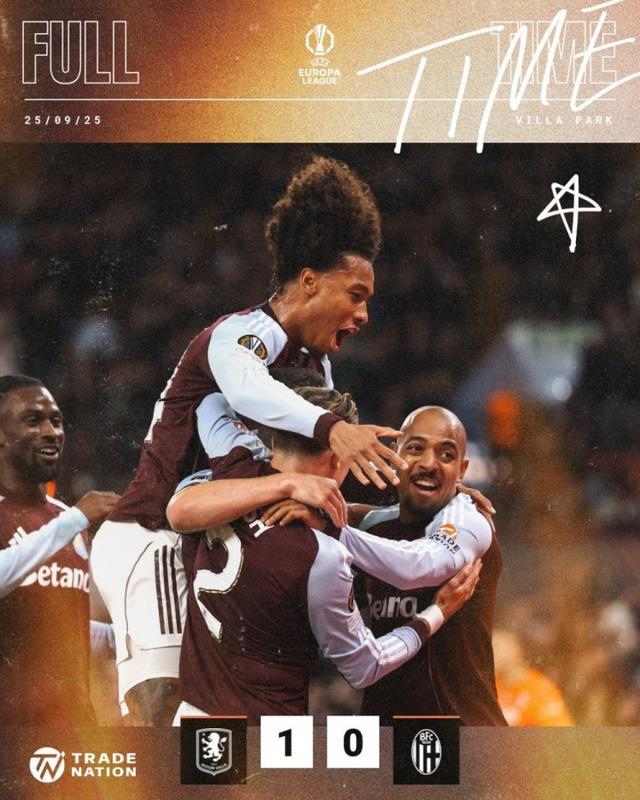 直播吧9月26日宣 欧联杯联赛阶段第一轮,维拉主场1-0战胜博洛尼亚收获赛季首胜,赛后维拉官方发布海报庆祝。