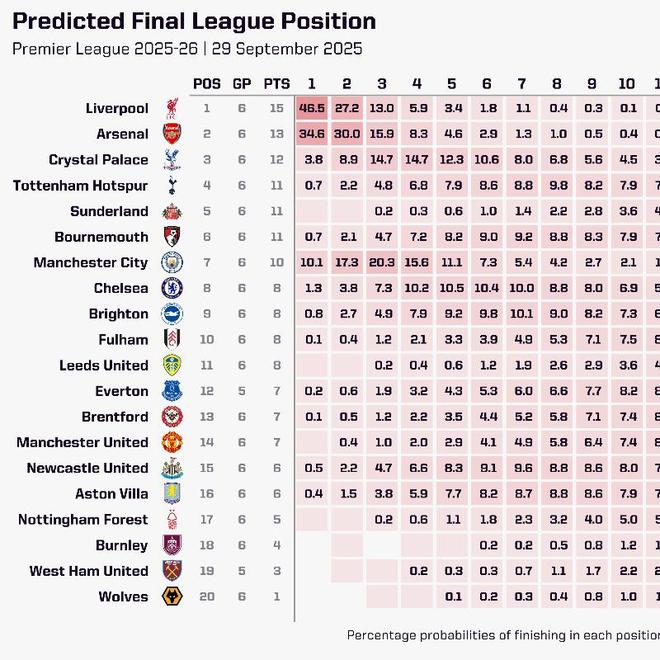 雷速体育9月29日宣 新赛季英超联赛进行到第6轮,国外数据机构使用超级计算机更新了对本赛季最终积分榜的预测,利物浦仍以46.5%的夺冠率位居第一。