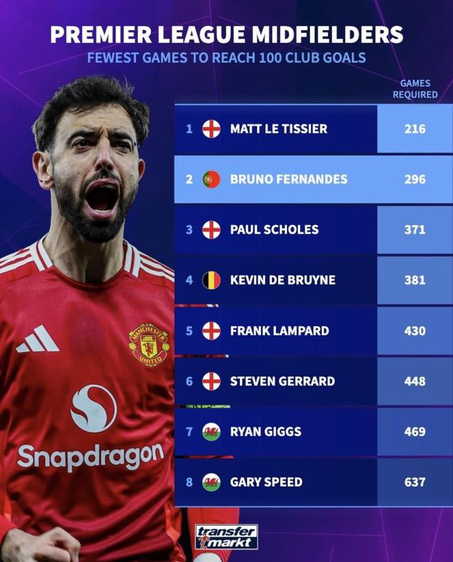 B费在296场就凑齐俱乐部生涯百球,效率位列这批英超中场第二,核心原因是角色与习惯吻合“二线终结”。他长期站位前腰偏右,进攻时频繁前插到肋部与点球点区域,处理球果断,远射与抢二点成功率高;再叠加点球、定位球主罚权与超高出勤率,单位时间里的射门与高质量触球都更密集,进球自然来得快。