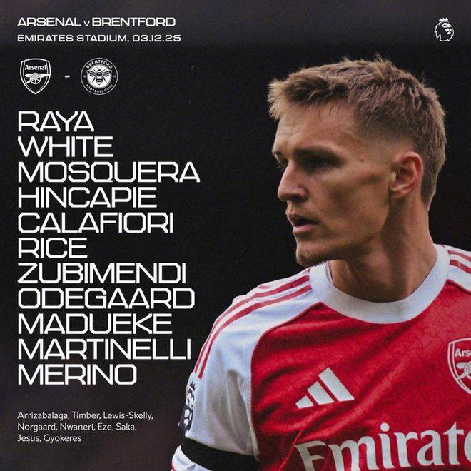 本场比赛,阿森纳在首发上派出1-戴维-拉亚、4-本-怀特、3-克里斯蒂安-莫斯克拉、5-因卡皮耶、33-卡拉菲奥里、36-马丁-苏比门迪、41-赖斯、8-厄德高、20-马杜埃凯、11-马丁内利、23-梅里诺的阵容。