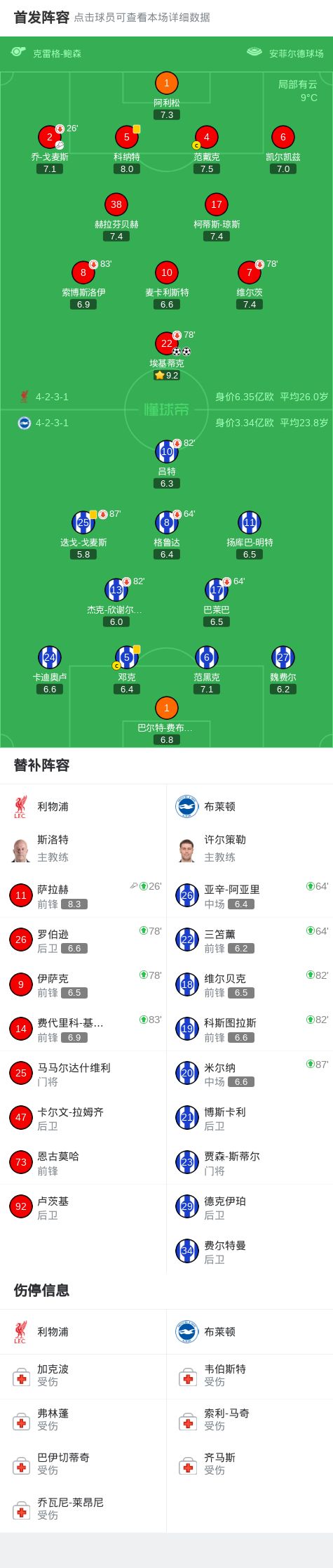 北京时间12月13日,英超联赛第16轮,利物浦坐镇主场迎战布莱顿。上半场,埃基蒂克开场闪击破门。随后送出助攻的乔-戈麦斯受伤被萨拉赫换下。迭戈-戈麦斯飞踹维尔茨染黄;下半场,萨拉赫角球进攻,埃基蒂克梅开二度。尾声阶段,小基耶萨无私横传,萨拉赫错失机会。最终利物浦主场2-0战胜布莱顿,收获两连胜。