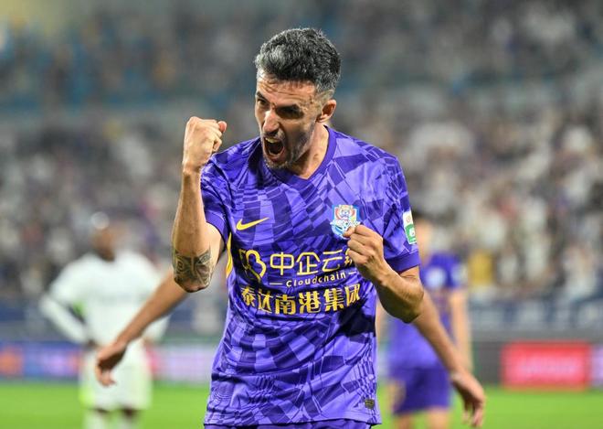 9月14日,天津津门虎队球员基莱斯在比赛中庆祝进球。新华社记者 孙凡越 摄