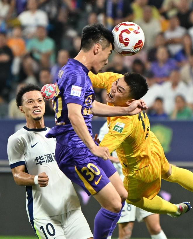 9月14日,天津津门虎队球员王秋明(上)在比赛中头球攻门得分。新华社记者 孙凡越 摄