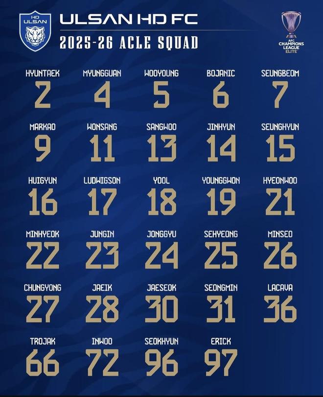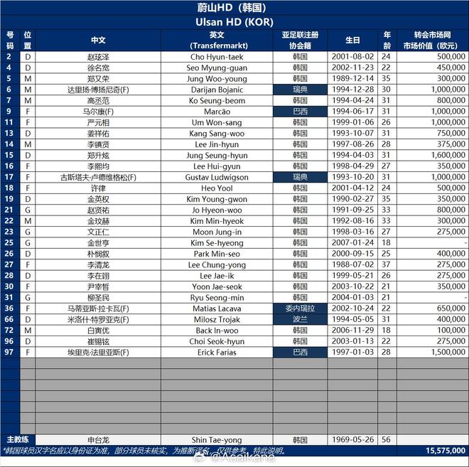 北京时间9月15日,德国转会市场亚洲区管理员朱艺 公布了蔚山HD(韩国)亚冠精英联赛(联赛阶段)的大名单。